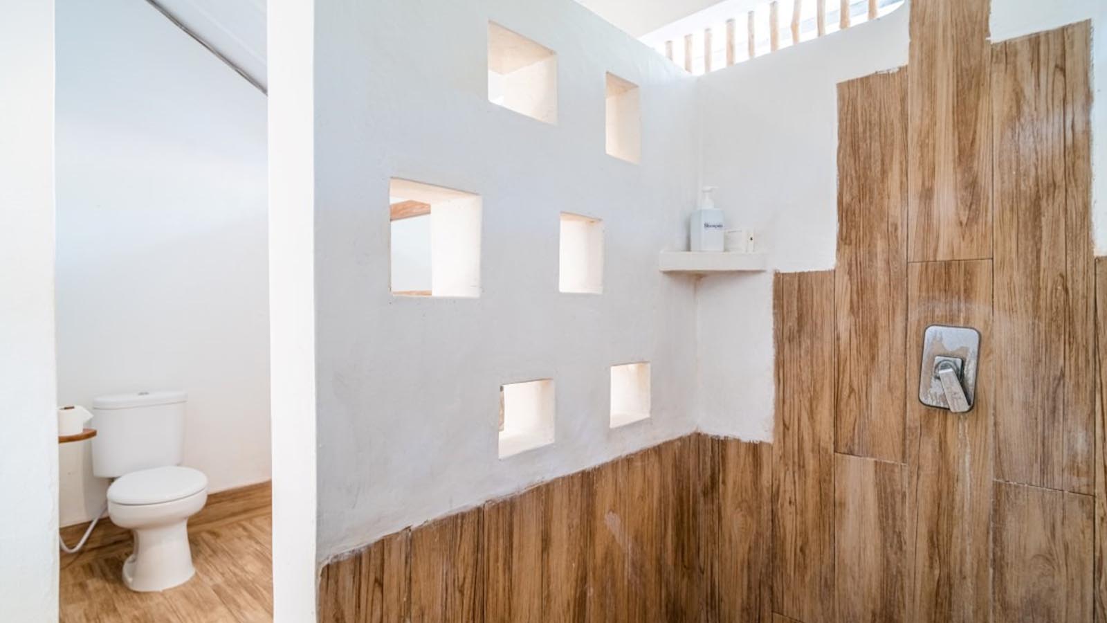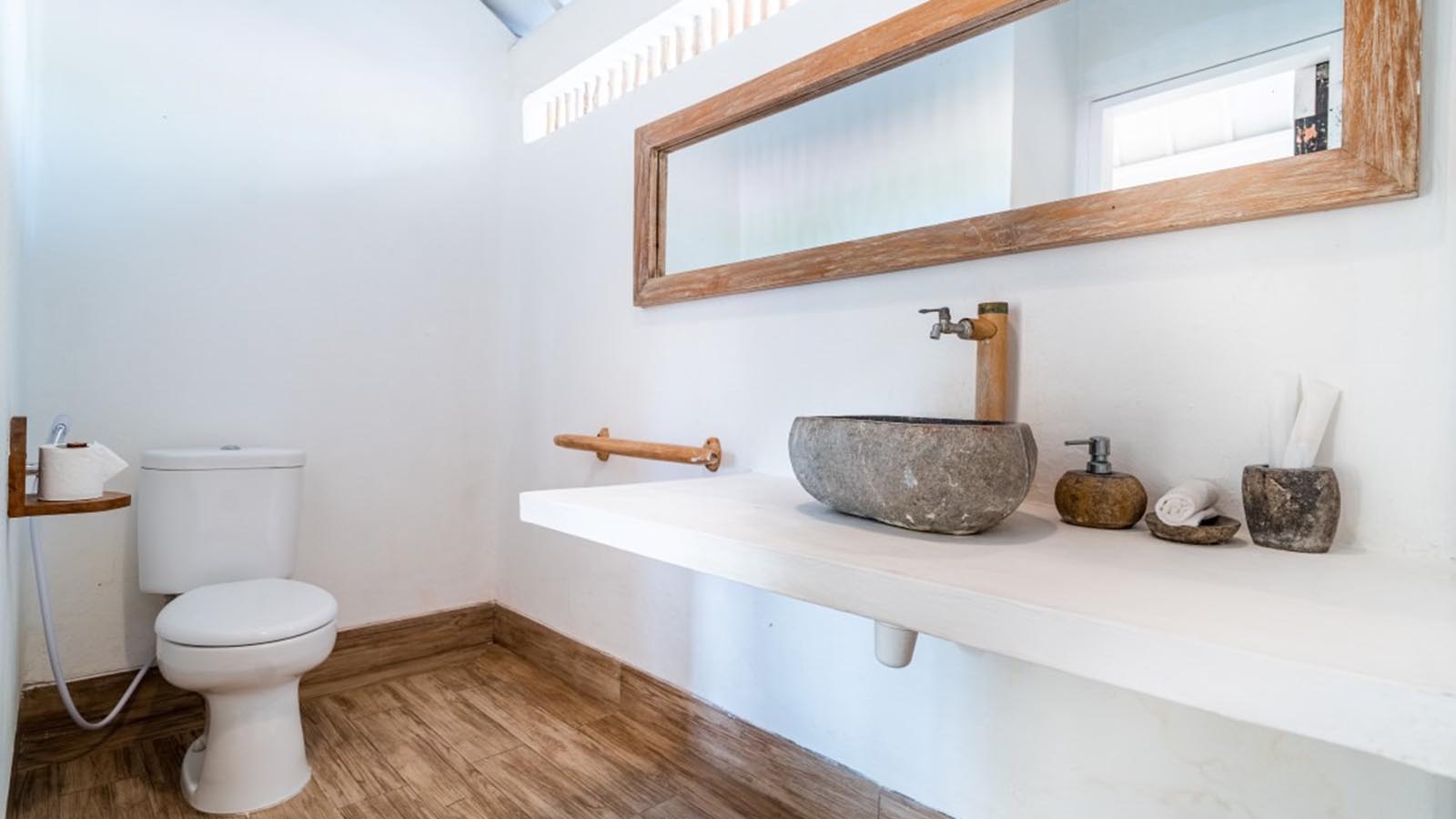 The bathroom features a spacious shower with hot water and plenty of hooks and dry racks to hang your wet gear after time in the beautiful waters around Lembongan.