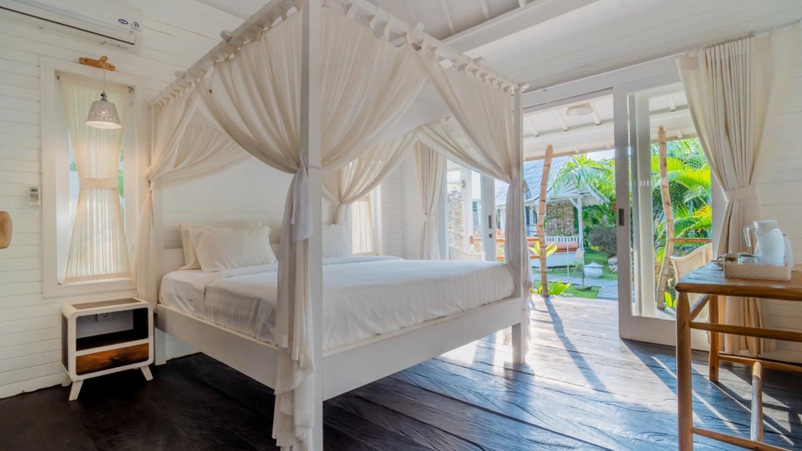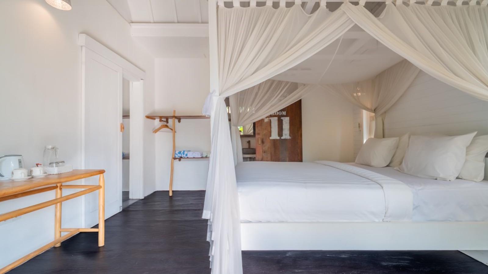 Rooms feature elegant, ethnic minimalist decor, combining all-white aesthetics with various wood textures and Balinese craftsmanship in the details. All Rooms feature a private terrace and an ensuite bathroom.